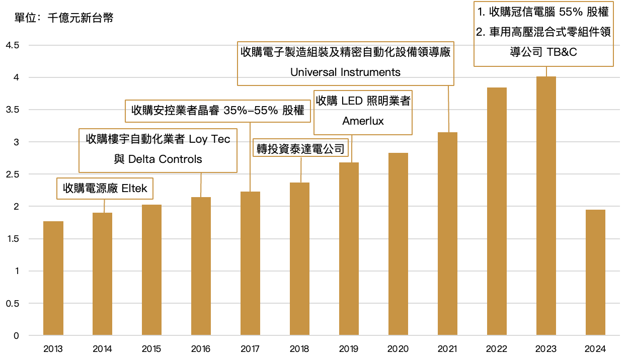 鄭平於 2012 年開始擔任執行長,也是帶領台達電進行轉型的關鍵人物,主要有兩大策略,首先是將台達電的定位從零組件供應商,轉型成解決方案供應商,第二個是透過策略併購快速擴大版圖,使得公司跨足業務更加多樣化,因此可以提供一站式的解決方案,使其相對其他廠商具備競爭優勢。