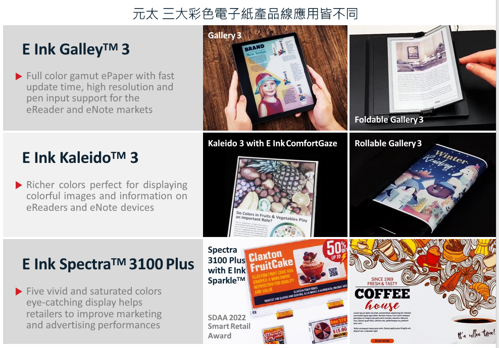 1. 元太掌握全球大多電子紙技術(包括電子紙專利、材料、薄膜技術),並已發展彩色電子紙,目前旗下彩色電子紙技術可分為三大領域: