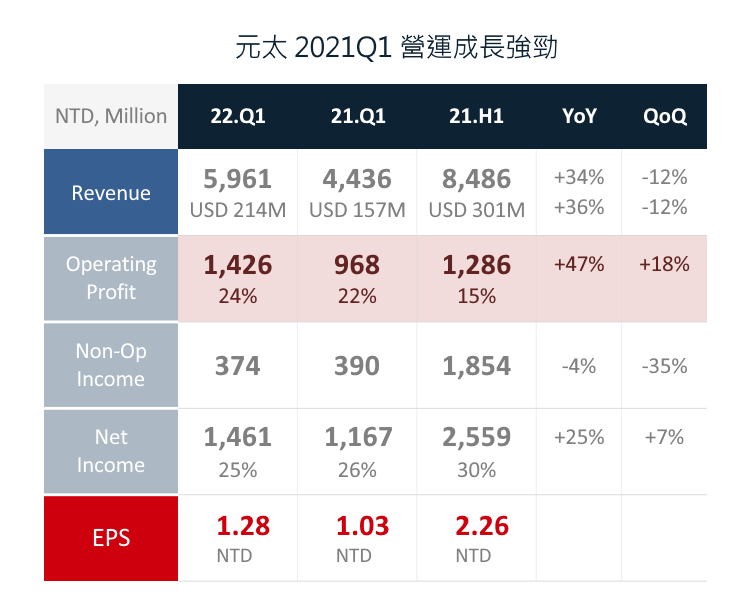 8. 財務方面,元太 2022Q1 營收為 59.6 億元,QoQ-12%,YoY+34%,主要動能來自 ESL 的拉貨及新產線的投產;毛利率為 48.2%,QoQ+6 ppts,YoY-1.7 ppts,上升原因為高毛利的 ESL 佔比增加;營業利益 14.3 億元,QoQ+18%,YoY+47%;稅後淨利 14.6 億元,較營業利益高的原因主要是來自面板廠的業外授權金持續貢獻收益。而 EPS 為 1.28元,QoQ+0.08 元,YoY+0.25 元,整體營運維持強勁成長。