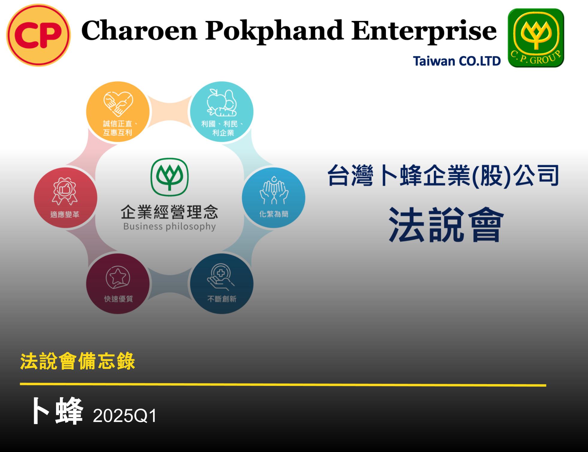 - 核心業務:卜蜂為台灣垂直整合的農畜食品領導企業,業務範圍涵蓋飼料生產、畜牧養殖 (雞、豬)、生鮮肉品及食品加工,形成完整的一條龍產業鏈。