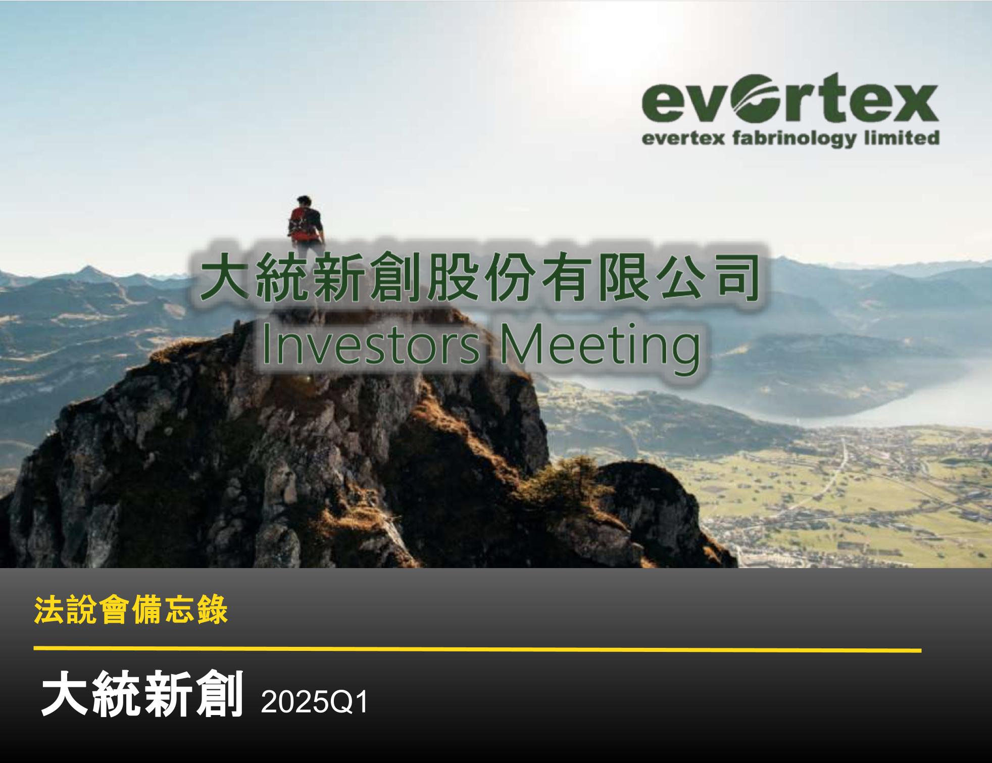 - 核心業務:大統新創成立於 1986 年,初期從事專業染整代工,後發展為集織布、染整、銷售於一體的一貫作業紡織廠。