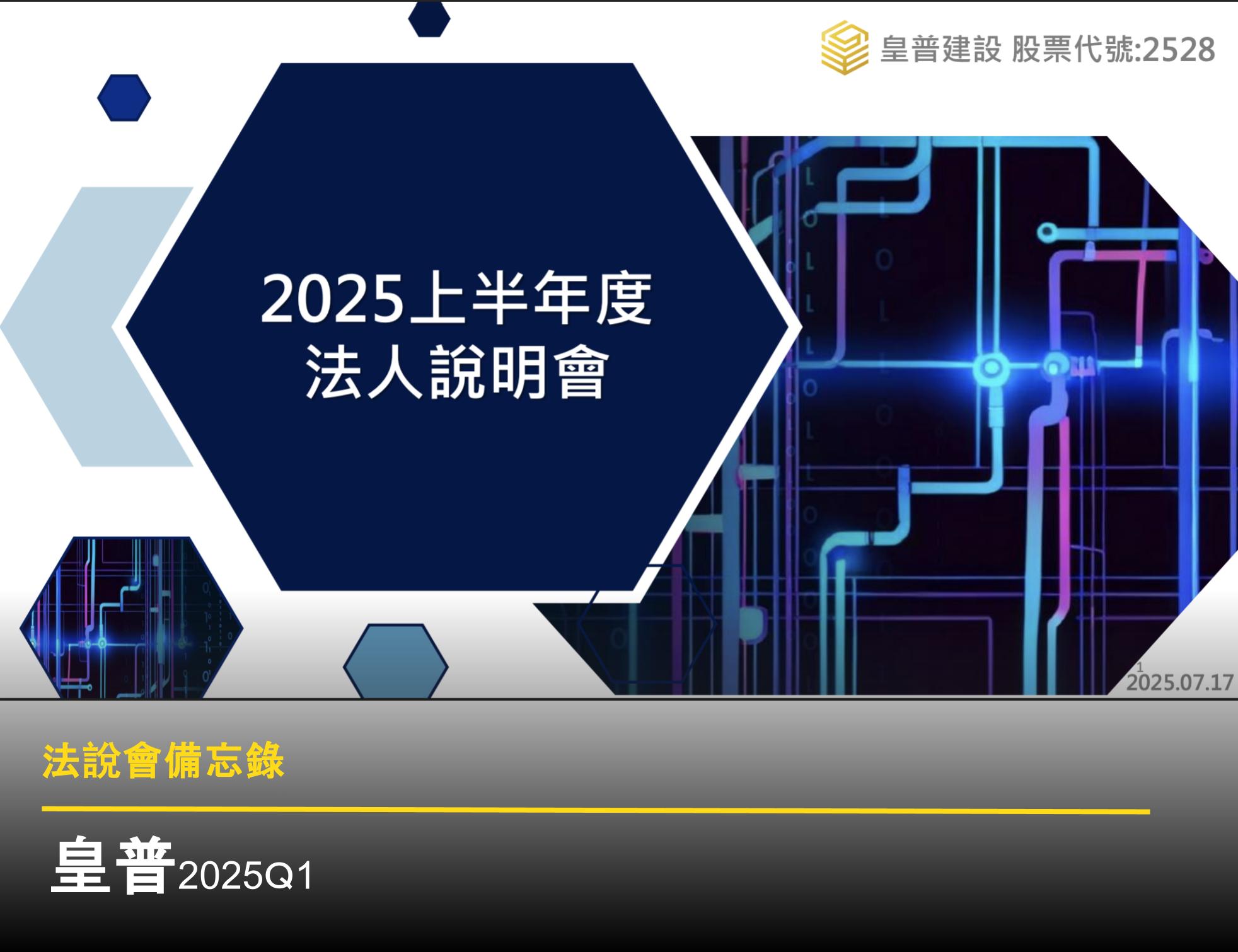 - 未來展望:公司預期隨著「皇普莊園」與「皇普摩天 100」等建案持續交屋,2025 年第二季至第四季的營收表現將相當亮眼,並維持穩定的建案完工入帳節奏。