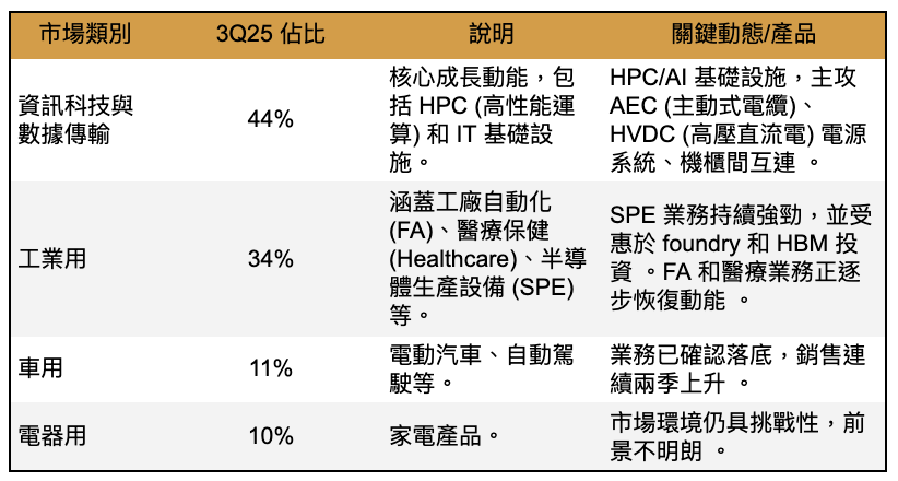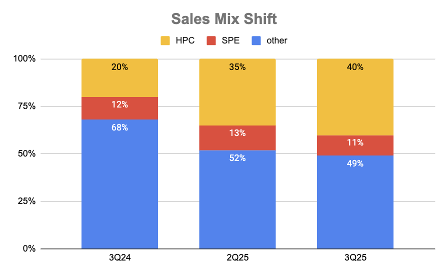 銷售結構變動 (Sales Mix Shift):HPC 與 SPE (半導體生產設備) 業務持續領航成長 ,佔總銷售的比重從 3Q24 的 32% (HPC: 20%, SPE: 12%) 顯著提升至 3Q25 的 51% (HPC: 40%, SPE: 11%) 。