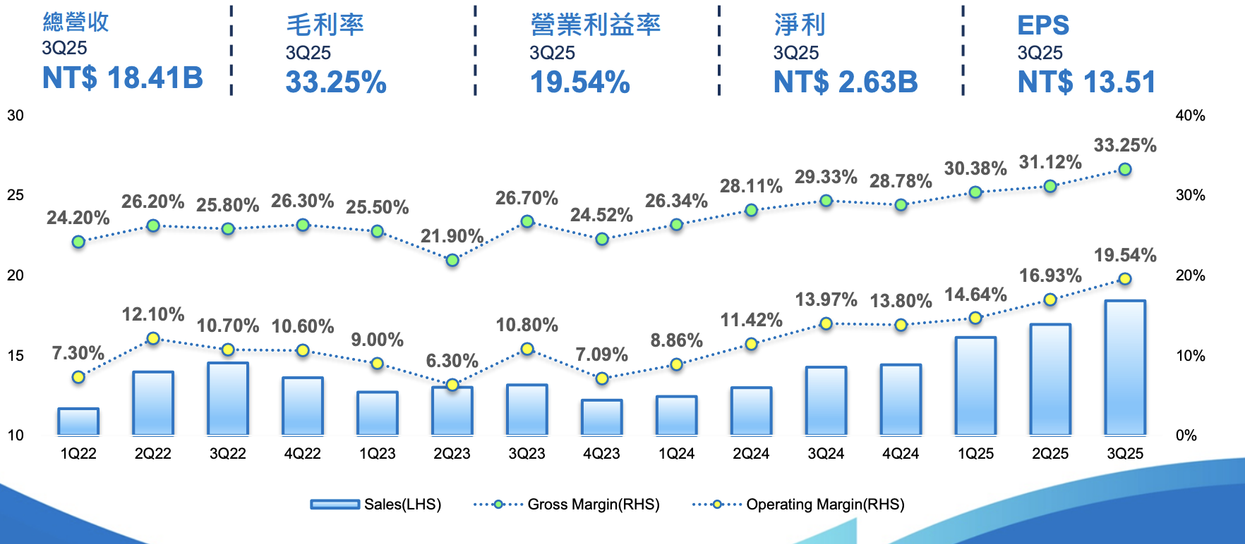 財務亮點 (3Q25):總營收達 NT$ 18.41B ,毛利率為 33.25% ,營業利益率為 19.54% ,淨利達 NT$ 2.63B ,EPS 為 NT$ 13.51 。
