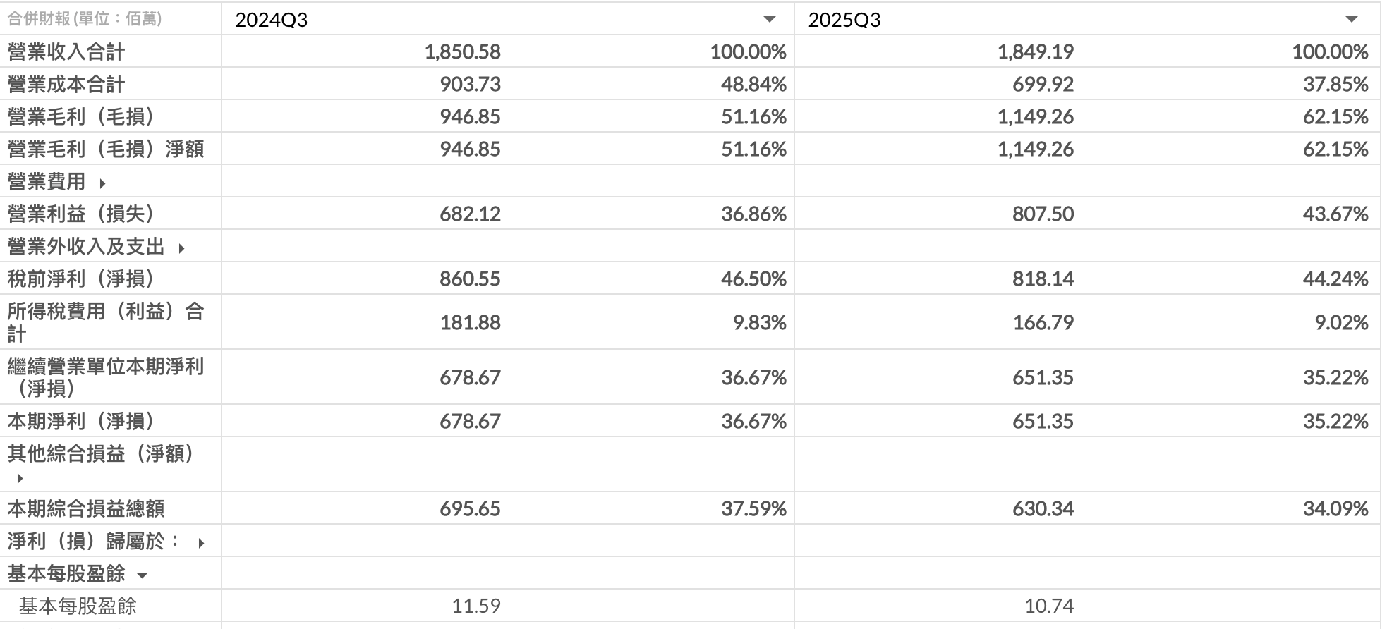 - 財務表現: 2025 年前三季營收為 18.5 億元,與去年同期持平。然而,受惠於高階產品組合優化,毛利率顯著提升至 62% (去年同期為 51%),帶動營業利益年增 18%,達 8.07 億元。惟受匯損約 1 億元影響,稅後每股盈餘 (EPS) 為 10.74 元,較去年同期的 11.59 元略減 7%。