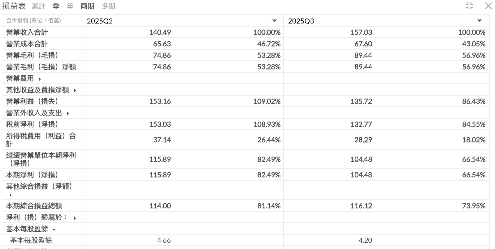 - 營業毛利:2.33 億元,毛利率 55% (累計),第三季單季達 57%。