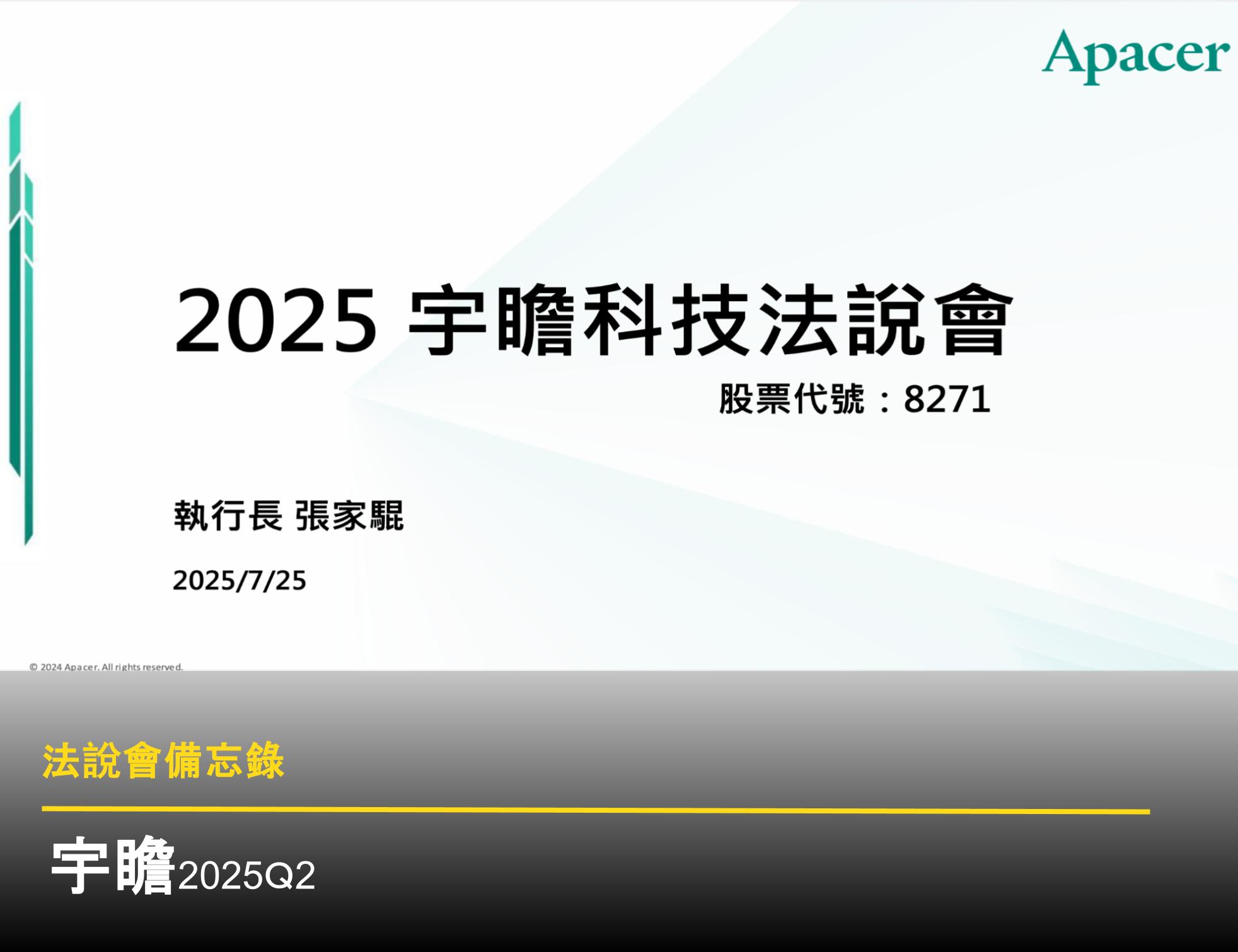 - Q:下半年各產業景氣看法?公司是否有直接投入 AI 或 CSP 雲端服務商的產品線?A:記憶體產業與 AI 息息相關。DDR4 之所以缺貨,是因為原廠將產能大量轉去做 HBM 及 DDR5。宇瞻的營運與此大趨勢連動。美國市場雖非最大佔比,但為規避關稅風險,7 月已將部分需求提前出貨。