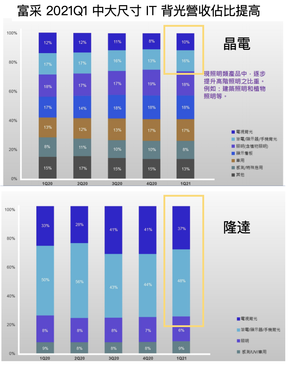 1. 富采投控由 LED 晶粒廠晶電及模組廠隆達於 2020Q4 合併成立,其營收佔比約為晶電 65%、隆達 35%。其中晶電的終端應用多元,包括中大尺寸顯示器背光、照明、顯示看板、車用及感測等應用,各業務營收佔比平均。隆達方面,則以中大尺寸顯示器背光佔營收約 85% 為主。