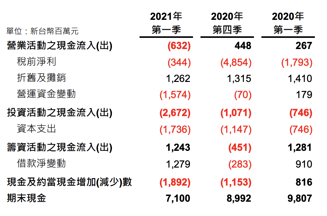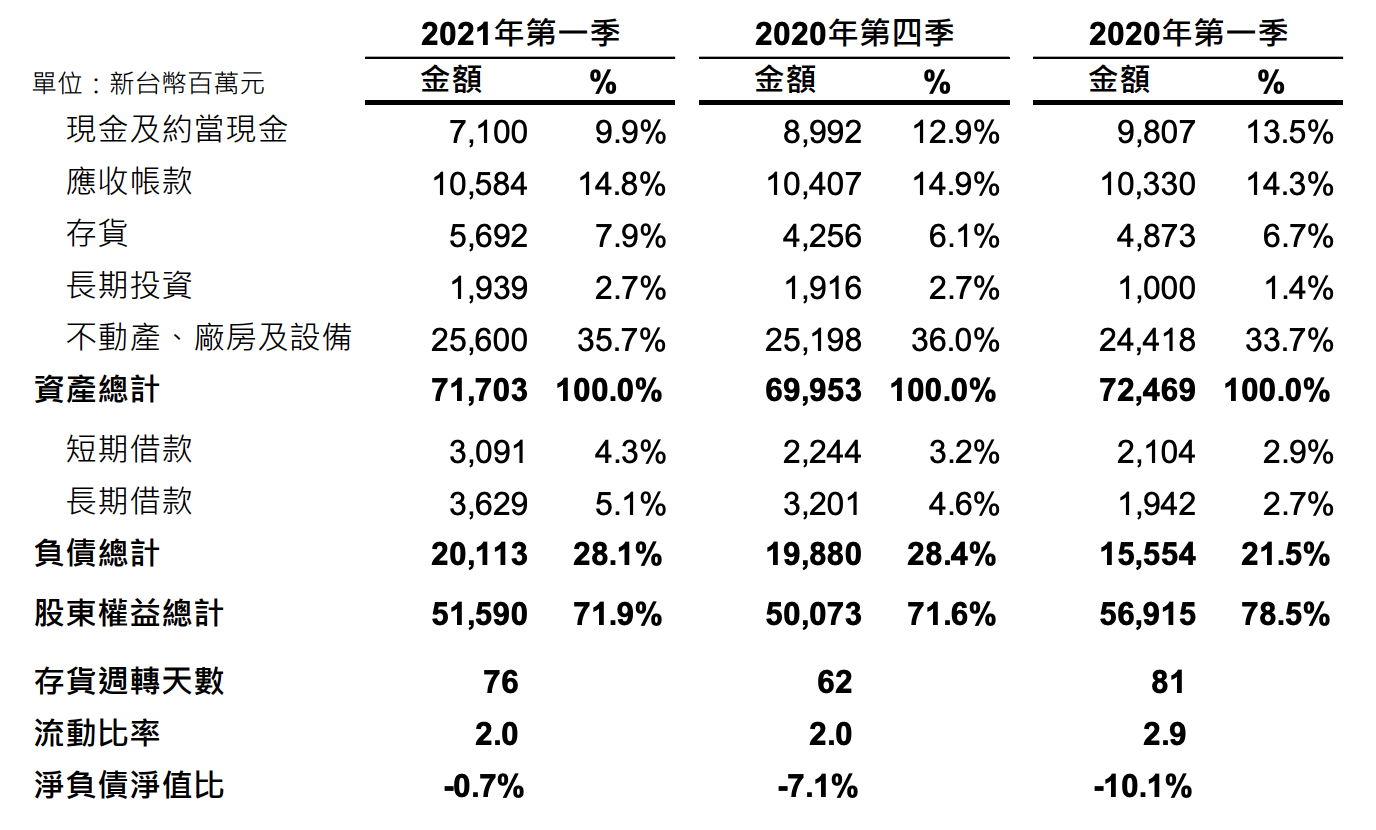 公司 2021Q1 帳上現金為 71 億元,淨現金為 5 億元(約當現金-總借款),現金水位充足。而庫存水位約 57 億元,QoQ+ 14 億元,主要為 Mini LED 量產提前備貨,目前終端訂單強勁,並無庫存過剩的風險。