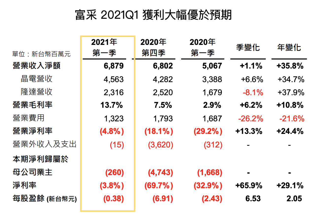 1. 富采 2021Q1 營收為 68.8 億元新台幣(以下同),QoQ+1.1%、YoY+35.8%;毛利率 13.7%,QoQ+6.2 ppts,YoY+10.8 ppts,毛利率大幅成長主要原因包括產能利用率大幅提高、Mini LED 毛利率較原產品線高、集團議價能力提高、車用、建築、植物照明等高毛利產品產比提高等原因。