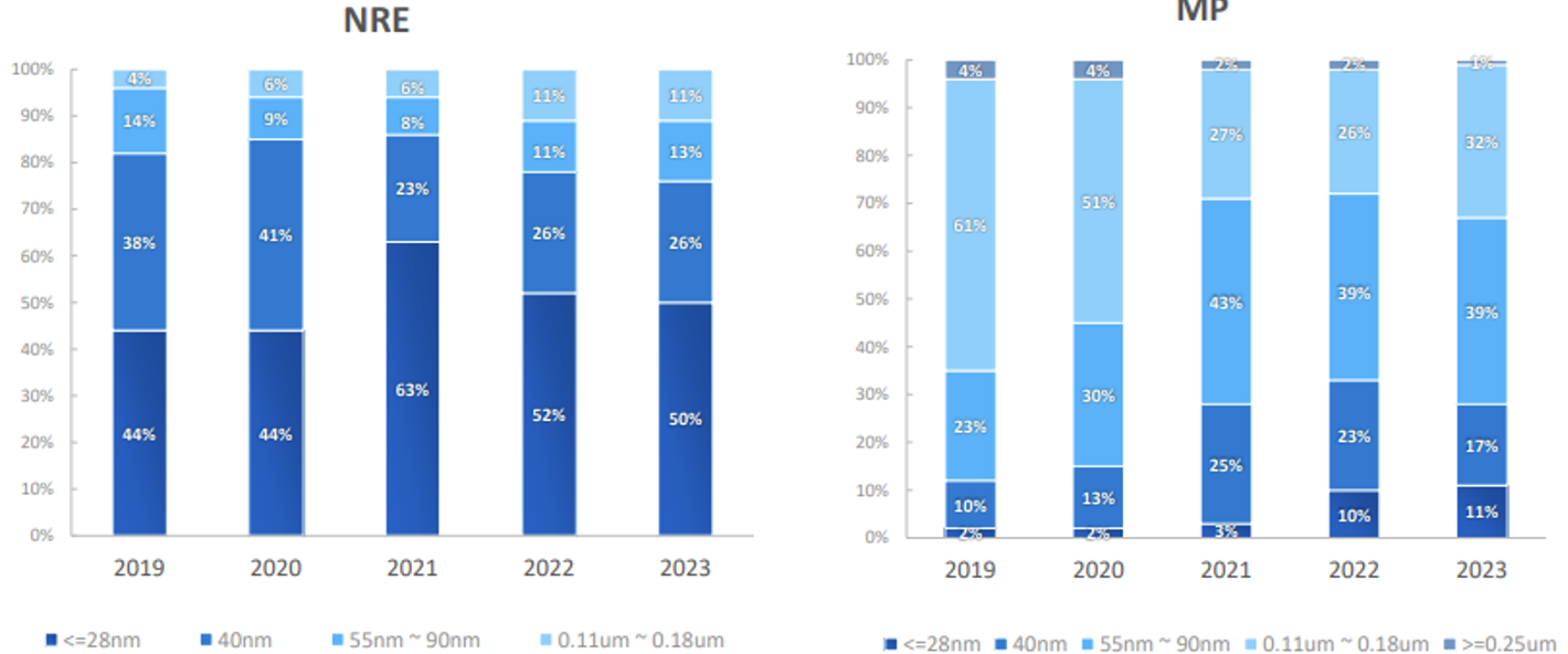 智原自成立以來,便聚焦在成熟製程的 Turnkey solution(28nm 以上),並與晶圓廠暨前東家聯電深度綁定。但近年公司逐漸往 28nm 以下製程發展,在可看作 Turnkey 業務先行指標的 NRE 部門中,過去三年(2021-2023) 28nm 以下的營收占比都超過 50%(2021 年特別高主要因疫情造成的晶片 overbooking),而 Turnkey 的佔比也從 2019 年只有 2% 提高到 2023 年的 11%,皆顯示公司轉型的成效漸露。