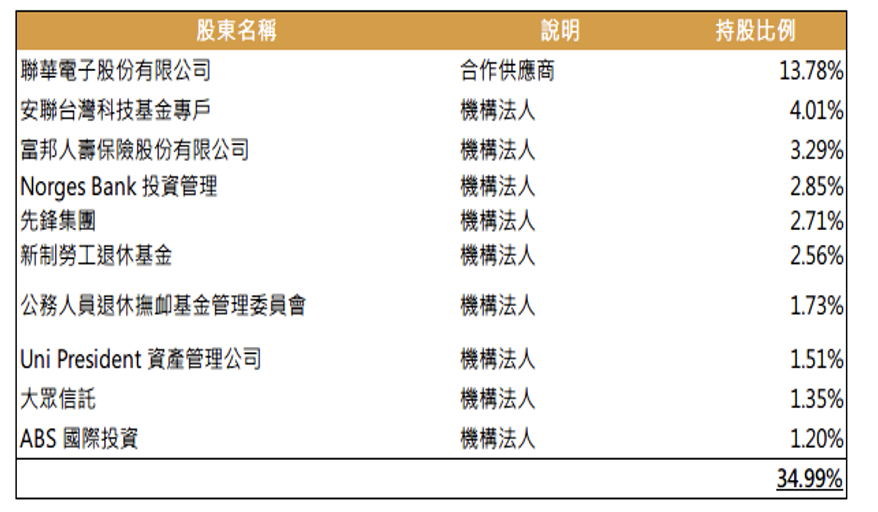 公司股本約 24.9 億元新台幣,目前聯電仍為最大股東,持股約 13.8%,其餘股權則大多集中在國內外的基金、資產管理公司等專業投資機構手中,前十大股東持股比約 35%,此部分股權尚屬穩定。