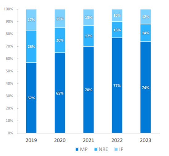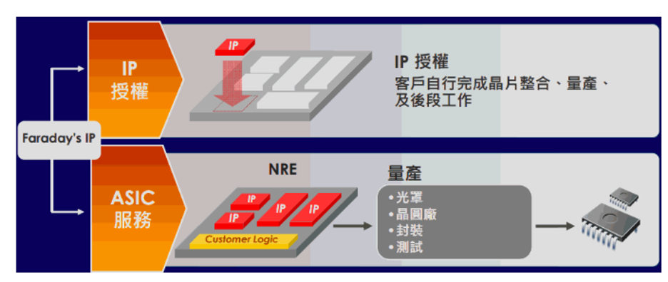 商業模式部分,IP 指公司授權 IC 電路的設計模板給客戶自行設計晶片,並收取一次性的授權金(License Fee)及量產後定期的權利金(Royalty)。