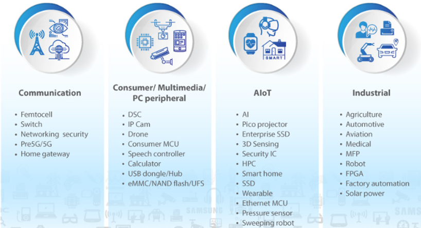 公司的晶片以各式 MCU、Flash、驅動 IC、控制 IC 為主,終端應用以通訊(小型基地台、網通交換器、家用閘道器)、車用工控(MCU、POS、GPS、航空、機器人、農業、醫療、智慧電表、太陽能、印表機)等非消費電子為主,長年營收占比超過 50%,其餘則為 AIoT(穿戴式 MCU、3D 感測)、消費性電子( USB、Flash、IP Cam、DSC 動態穩定控制系統)等,大多都屬於生命周期較長、成熟、需求較穩定的應用,客戶也以各 MCU 廠、工業品牌廠、系統廠、車廠等為主,且客戶佔營收比例也分散,未過度集中。(前三大約佔 30%,其中前兩大推測為工業系統廠各佔 10~14%,第三大為聯電佔 6%)
