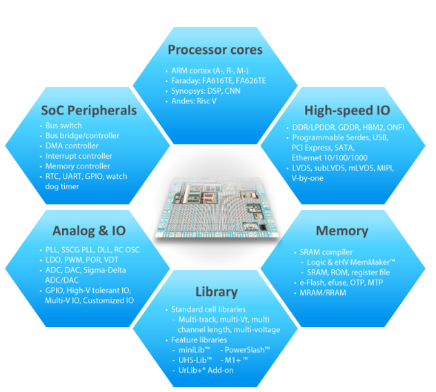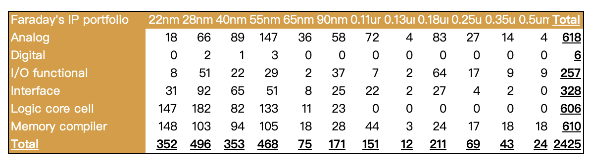 公司是少數擁有 IP 的 Turnkey solution 廠商,目前有超 3,000 項 IP,其中主要集中在 analog、logic core 和記憶體領域。這樣的好處是,公司可將自家 IP 用在 ASIC 上,以節省 IP 的授權成本。