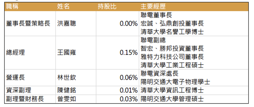 公司最大股東仍為聯電,然整體股權較為分散,且經營層持股比率低,需持續留意