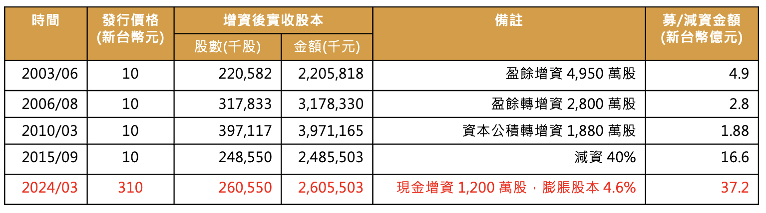 公司除了在 2015 年曾減資 40% 彌補虧損,過去 8 年除了員工認股權行使外,幾乎沒有其他的增減資動作。直到 2024/3 才公布辦理現金增資,預計共發行 1,200 萬新股,認購價為 310 元(較目前 340 元股價折價約 9%)。增資過後,約會稀釋股本 4.6%,並可籌備約 37 億元資金。增資過後,公司在手現金將接近 95 億元(帳上 57+ 增資 37 億元),佔總資產 56%,將有充足資金投入研發。