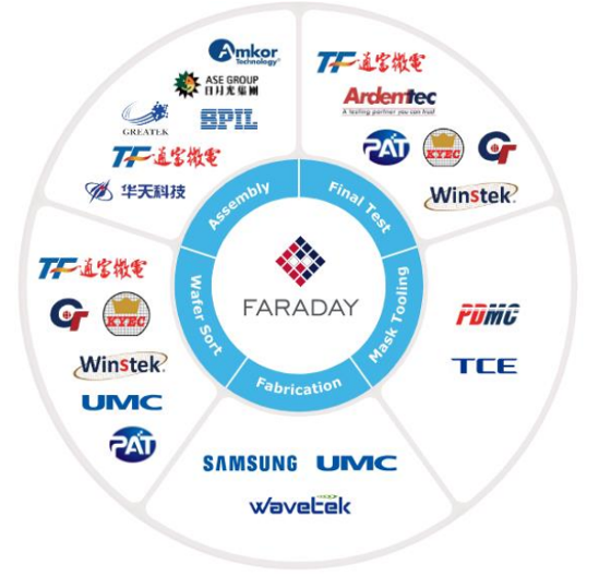在 NRE 及 Turnkey 部分,公司 28nm 以上之成熟製程主要與聯電深度綁定,而在 14nm 以下則主要和三星合作,專攻 AI、HPC 市場(包括 PCIe Gen 3/4/5、USB、HBM2、GDDR6、DDR5、I/O、CPU 等)。在後段封測,公司供應鏈則包括台灣的 京元電、欣銓、超豐、日月光,中國的華天、道富機電,以及韓國的 Amkor 。