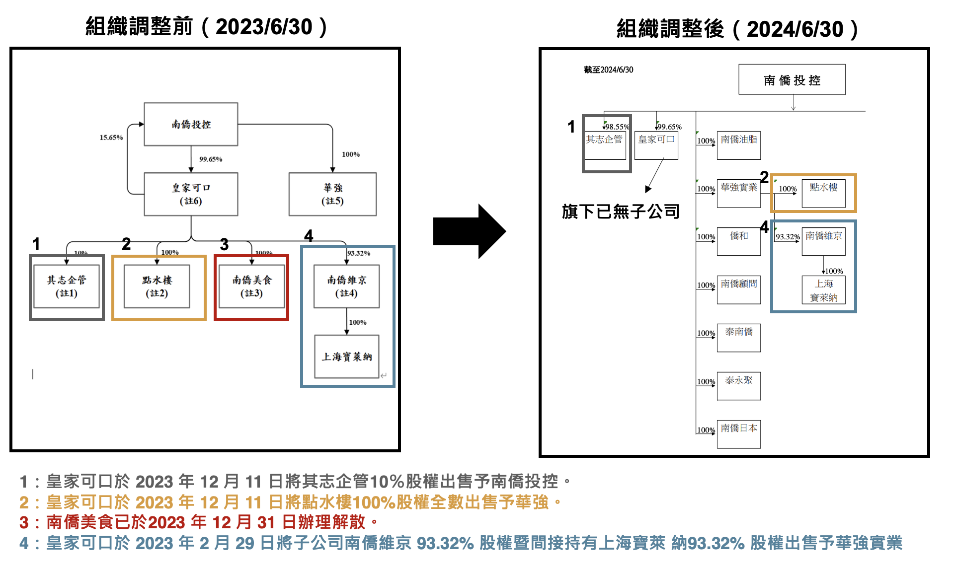 * 南僑(市:1702)在 2023 年進行組織調整,將皇家可口旗下餐飲事業(如點水樓、上海寶萊納及南僑美食)販售給南僑及母集團其他公司,調整後業務僅聚焦於冰品、急凍熟麵兩大業務。