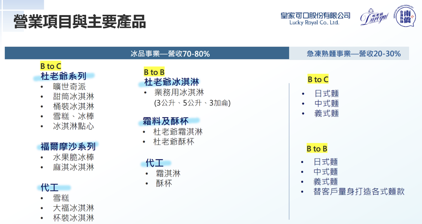 - 冰品:佔營收 70%~80%,毛利率約 35%,旗下品牌包含杜老爺、杜老爺曠世奇派、福爾摩沙冰品等,依業務內容區分有 B2B 及 B2C 兩大類: