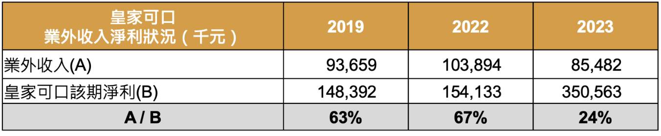 以 2019/2022/2023 來看,南僑貢獻的股利收入佔皇家可口當期淨利約為 63%/67%/24%,影響顯著,故在分析皇家可口時,亦須關注南僑的獲利表現及股利發放狀況。