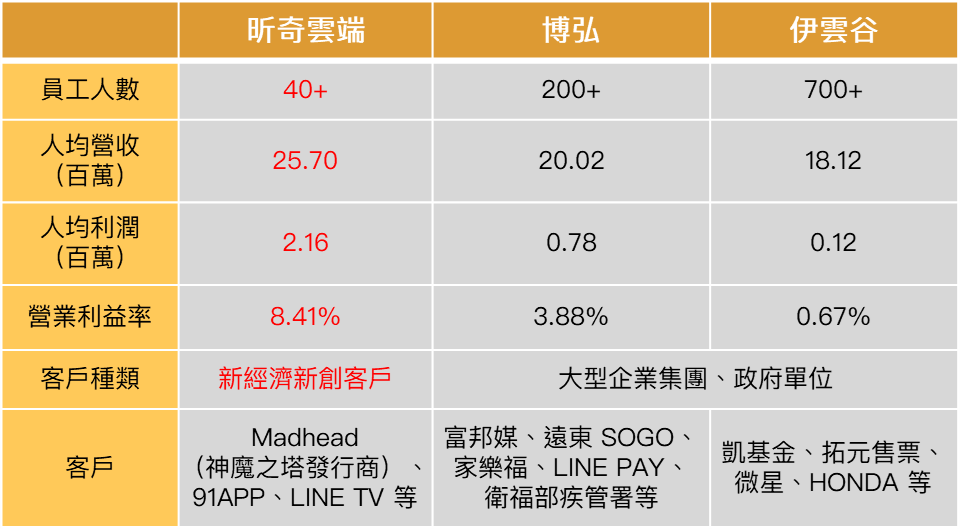 昕奇雲端運營商的特性,使其較同業有就高的人均營收及利潤