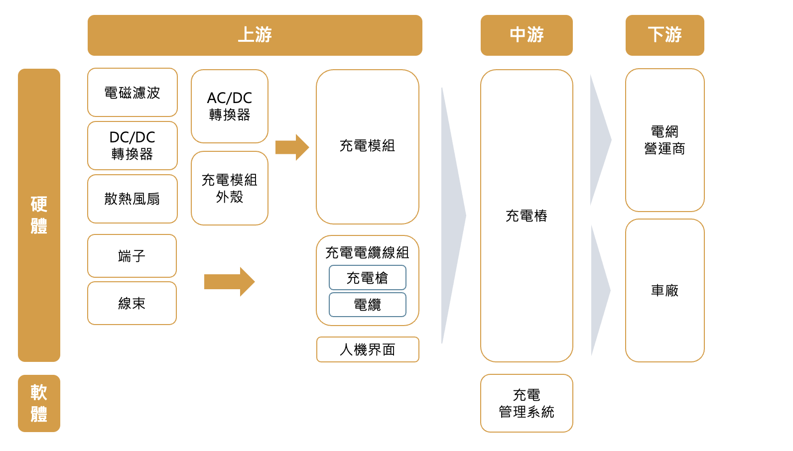 充電樁產業鏈可分為上游零組件、中游充電樁製造、下游營運商和車廠