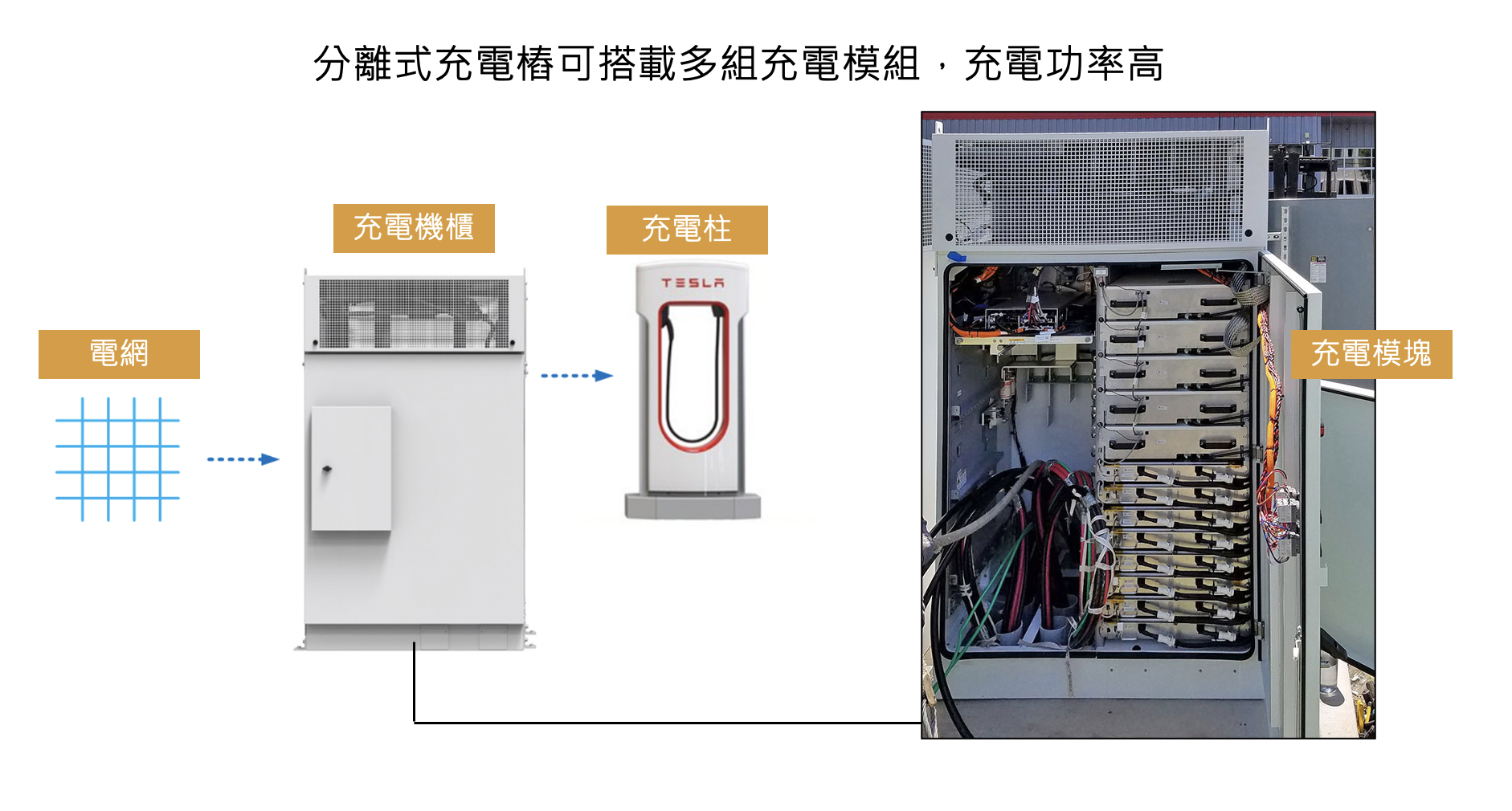 由於充電功率是由充電模組決定,例如 150kW 充電功率是由 5 個 30kW 的充電模組組成,高功率充電樁需要多組充電模組,因此較適合採用分離式充電樁。
