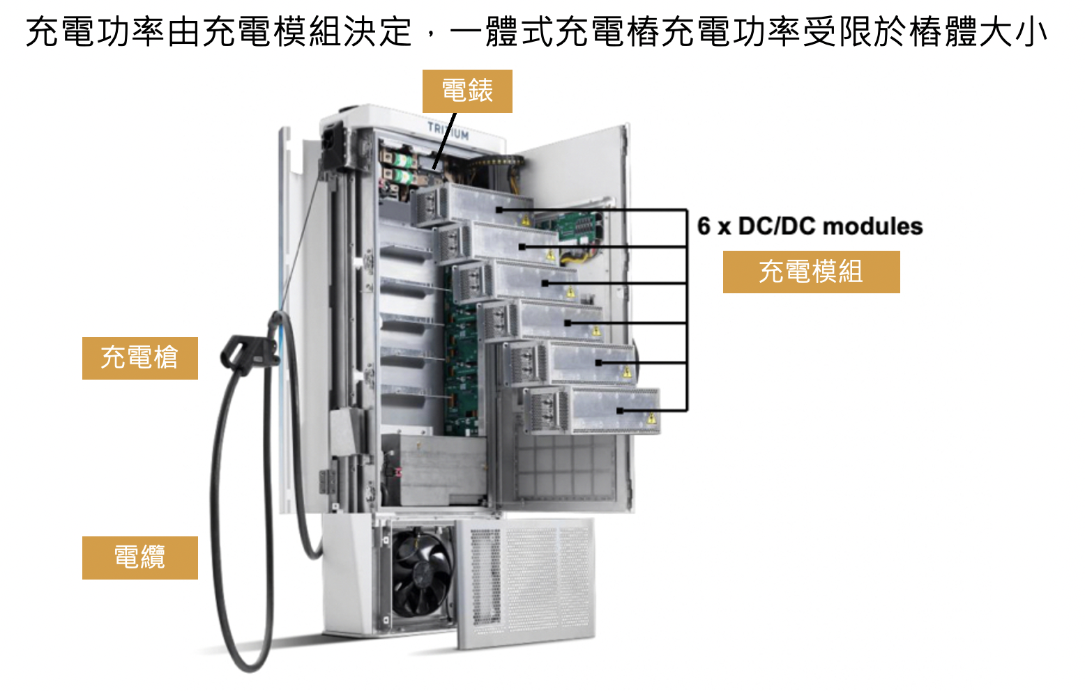 目前直流快充可以分為一體式或分離式充電樁,一體式充電樁是將充電模組、充電槍、電纜、人機界面、計費都組合在同一機組,分離式充電樁則是將充電模組移到充電樁外的充電機櫃,在充電機櫃中可以安裝多組充電模組,一台充電機櫃可供多個充電樁使用。