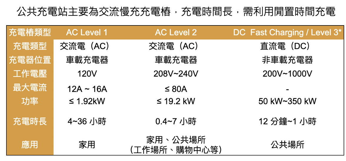註:SAE (國際汽車工程師學會)定義四種充電等級:AC Level 1、AC Level 2、DC Level 1及 DC Level 2,但現今 DC 快充規格已和當時定義的規格不同,同時目前普遍稱 DC 快充為 Level 3 充電樁,故採用現今主流規格和稱謂。