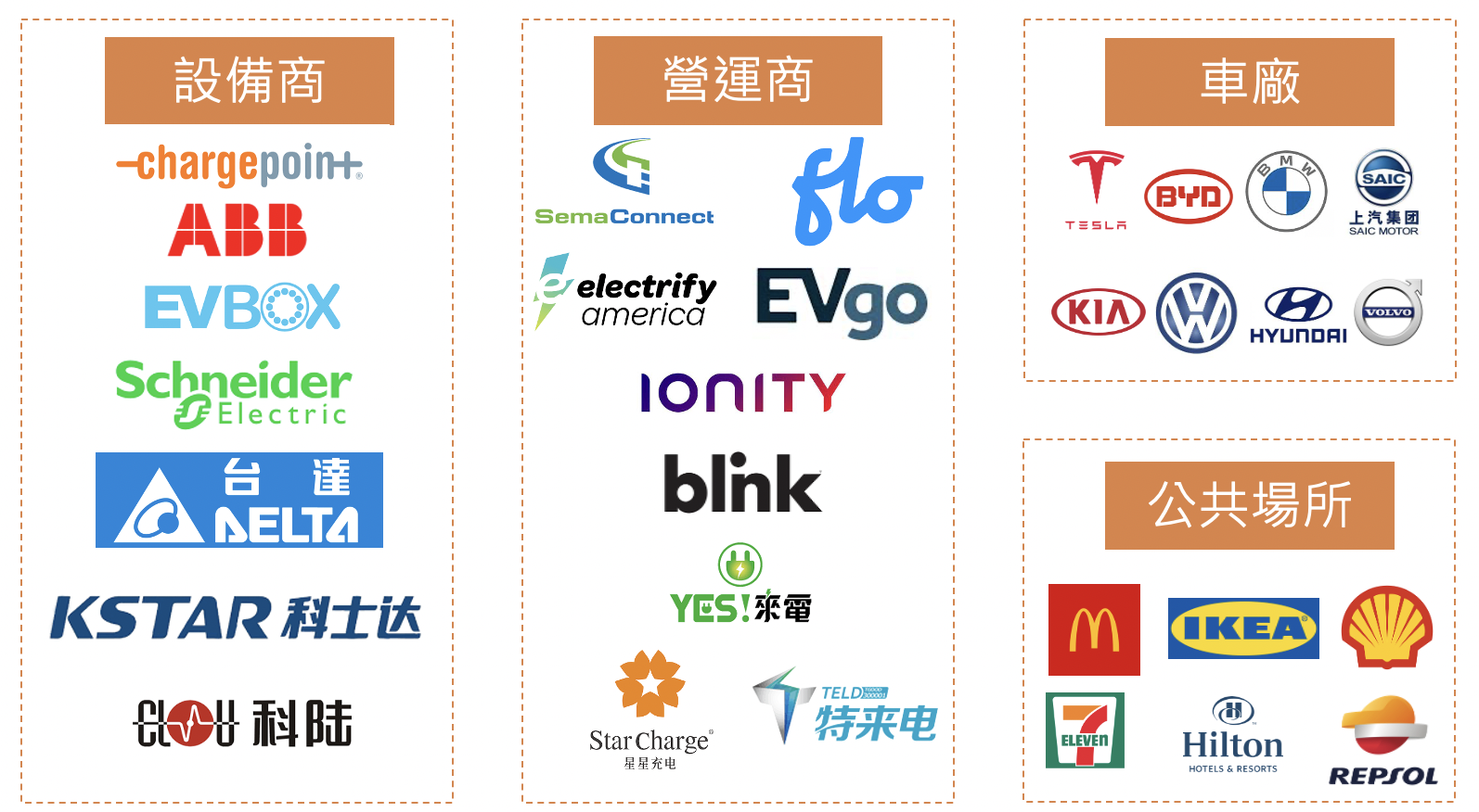 充電樁營運模式為設備商、營運商、車廠、公共場所四方組成,營運商為主要建設者