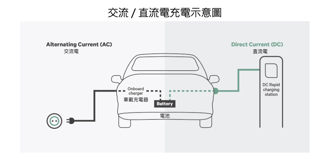 而直流快充則是將交流電直接在充電樁進行轉換,不需透過 OBC 充電,而因充電樁較無體積限制,因此,可用多組充電模組加大充電功率達成快充,目前 DCFC 約可在一小時內完成充電。