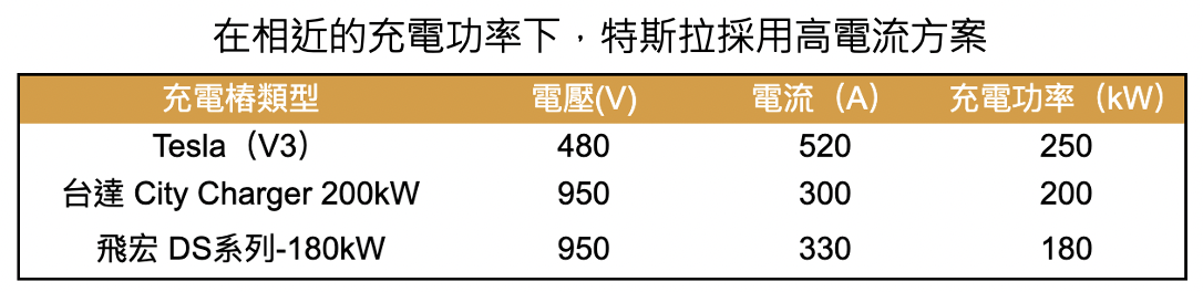 目前使用高電流方案的廠商為特斯拉,Tesla V3 Supercharger 充電功率為 250kW,電流高達 520A。