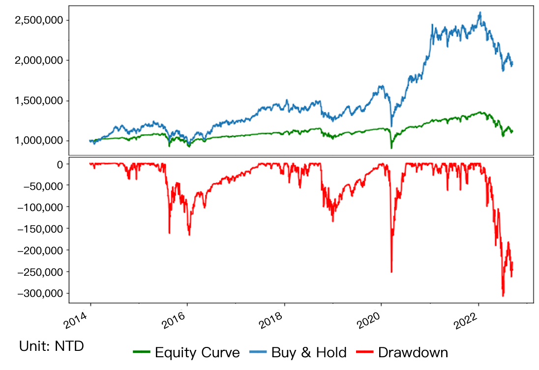 策略報酬率為 11.1%,績效仍遠不如買入持有策略,且於 2022 年初時出現總資產超過 30 萬的大回檔。而另一個可特別注意的點是交易次數高達 552 次,造成需共付出高達 182,939 元的佣金,已經超過我們的總報酬,顯示這樣頻繁交易的策略有很大部分的獲利會被交易成本所侵蝕。