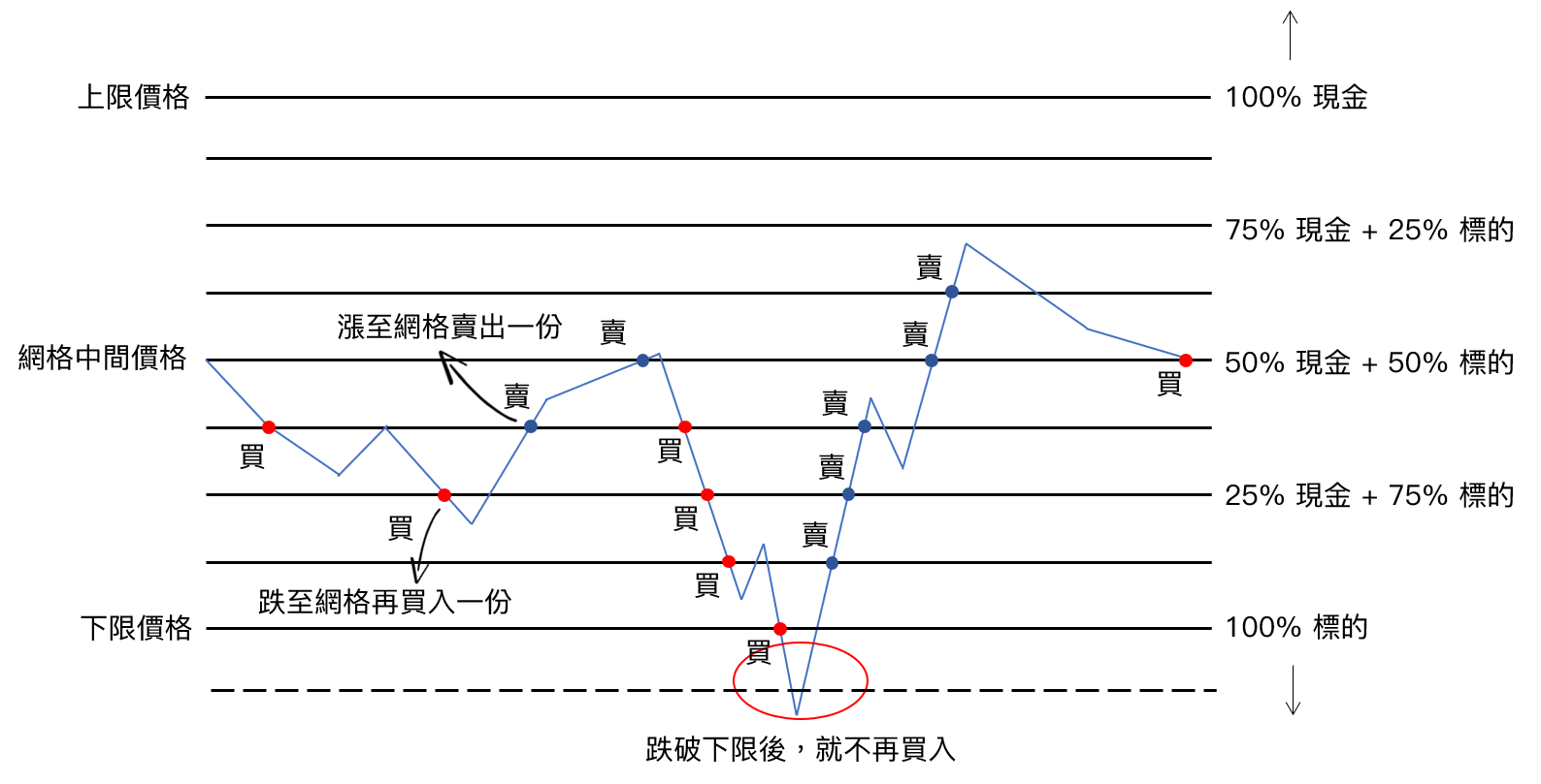 若價格持續下跌,會一路買到下限價格後停止買入(此時會是滿倉狀態),並等到價格反彈至網格內再開始賣出;同樣的,若價格持續上漲,會一路賣到上限價格後停止賣出,並等到價格回落至網格內再開始買入。