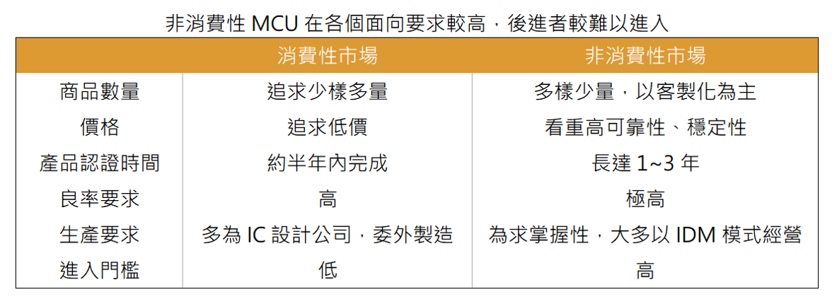 而非消費性 MCU 則屬於競爭門檻較高的市場(大多是 16、32 位元),以工業、車用兩大應用為主,目前市場多由歐美日巨頭:德國英飛凌(Infineon)、荷蘭恩智浦(NXP)、日本瑞薩電子(Renesas)、歐洲義法半導體(STMicroelectronics)和美國微晶片科技(Microchip)所供應,前五大巨頭合計就占有全球非消費性 MCU 80% 市占率,單看車用領域更高達 87%,呈寡占市場樣態。