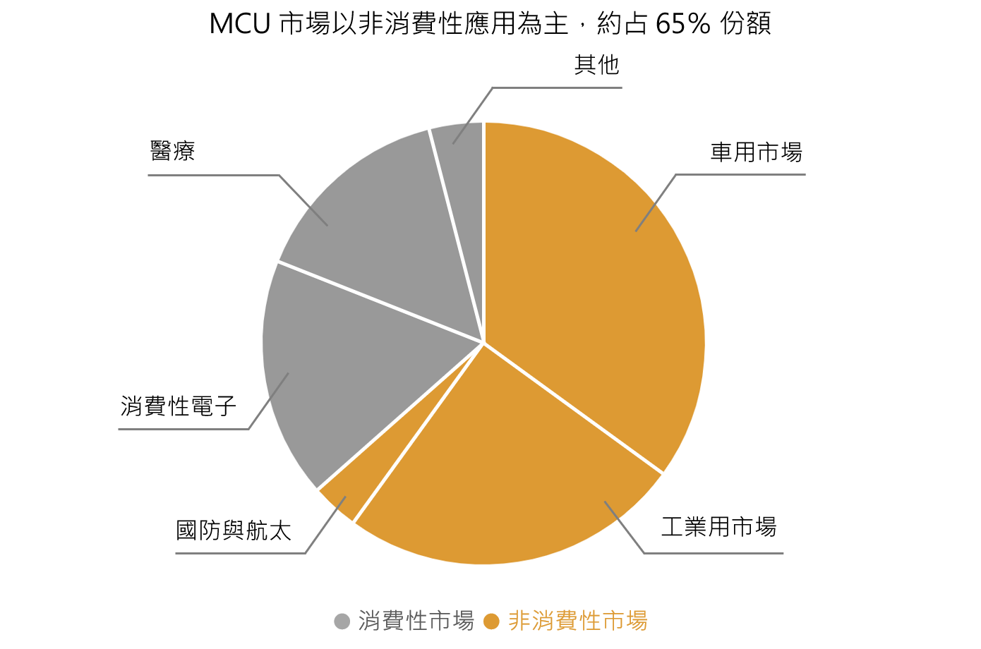 MCU 終端應用大致可分為消費性市場(智慧型家電、NB、PC、醫療器材等)及非消費性市場(工業控制、汽車產業等),其中又以非消費性應用為大宗,約占總市場 65% 份額。