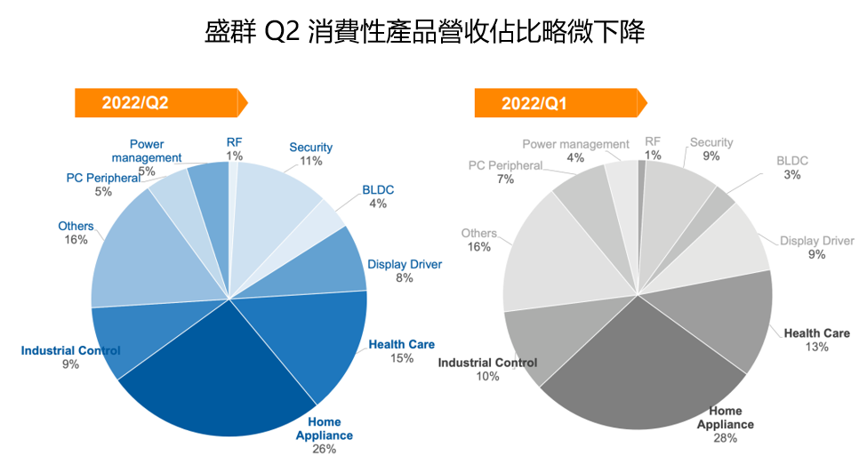 1.2022Q2 產品組合: 家庭應用 26%、健康照護 14%、工控 10%、面板驅動 8%、電腦週邊 6%、電源管理 5%、BLDC(直流無刷馬達)3%、其他 16%,其中消費性電子因需求降溫佔比為下降。