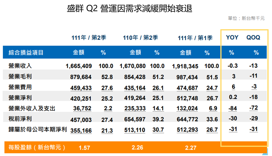 因需求放緩,預計 Q3、Q4 營收將較 Q2 衰退,而毛利率則因反應晶圓代工漲價及下游客戶殺價,將大機率跌破 50%。