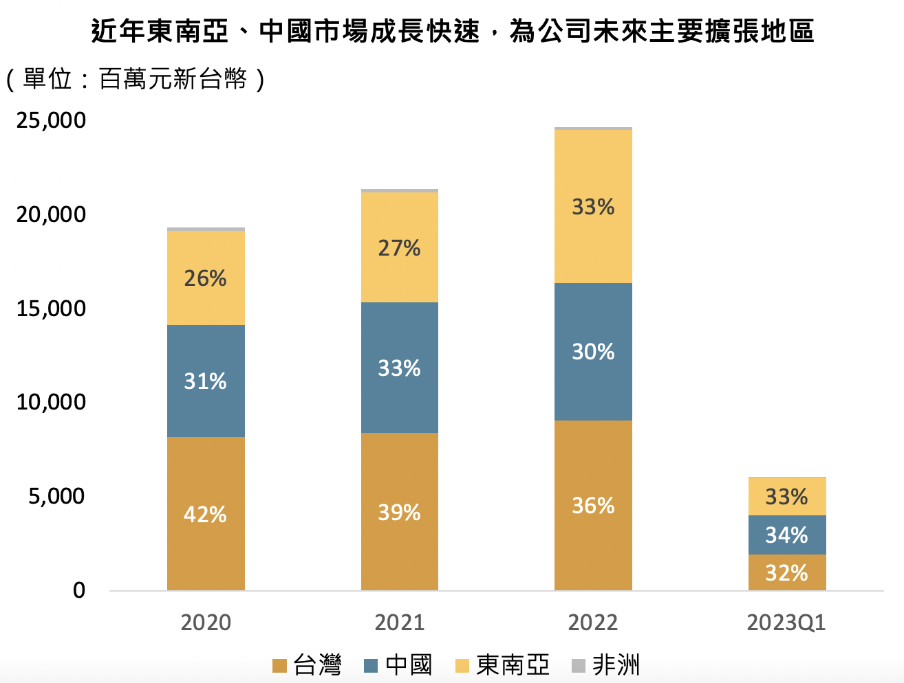 公司 2022 年營收地區占比為台灣 36%、中國 30%、東南亞 33%、非洲 1%,且無單一客戶之銷售占比超過 10%,地區、客戶集中風險低,近年因台灣市場已逐步飽和,海外市場以中國與東南亞市場為主要擴張地區。