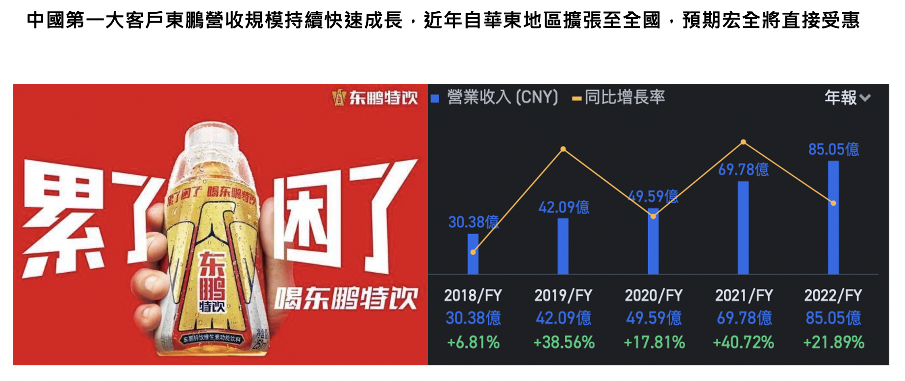 中國第一大客戶東鵬採低價策略於中國全境擴張,預期宏全將直接受惠於客戶營收規模成長