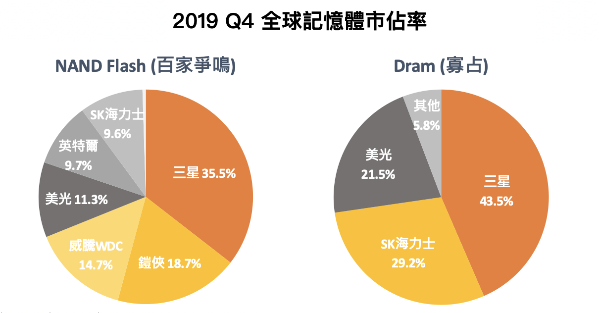 要回答這個問題就必須從記憶體的歷史說起,還記得 DRAM 以前曾和太陽能、面板及 LED 一起被戲稱為「台灣四大慘業」。而在這段蕭條的期間,南韓的三星、SK 海力士和美國的美光集團因為實力較強,不斷併購無法負荷虧損的小公司,再加上記憶體產業的高資本支出(不斷建廠)及先進製程的技術(人才、專利及高研發費用)堆疊起的高產業進入門檻,使 DRAM 市場形成了目前三國鼎立的狀態。