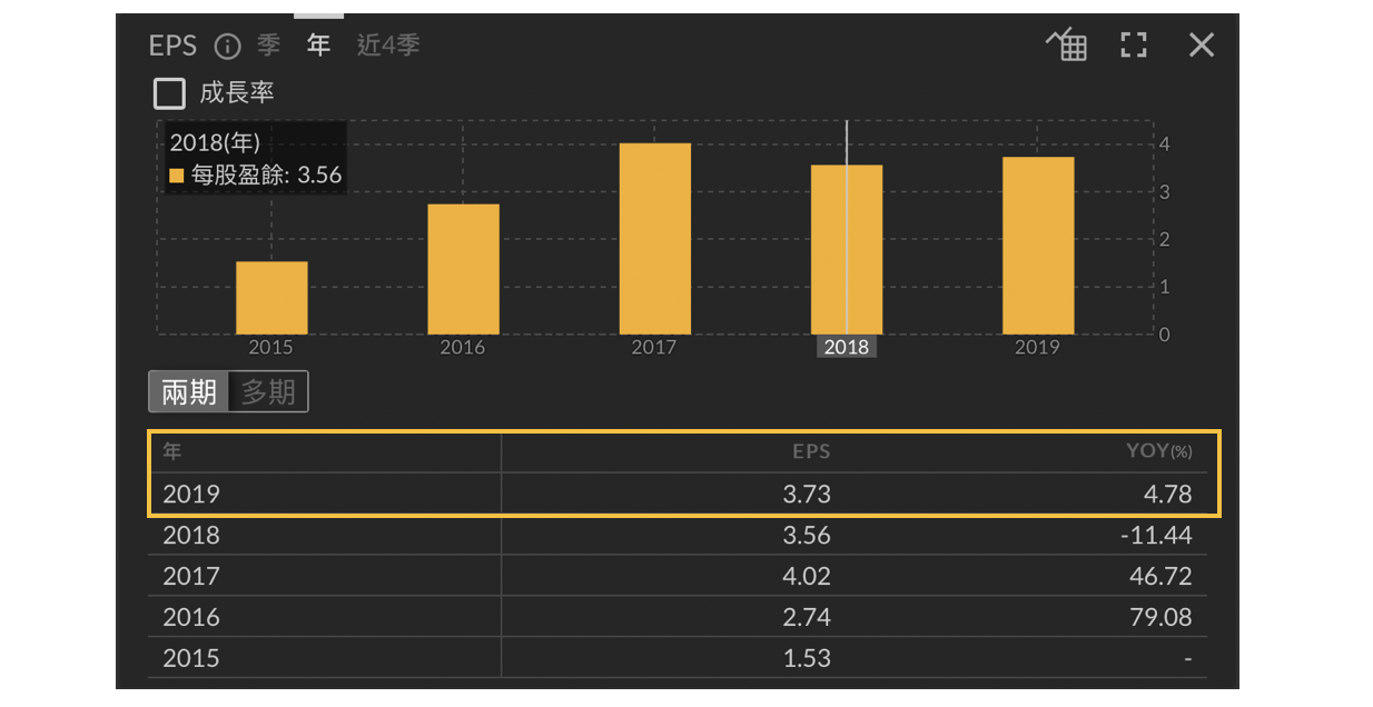 由以上可知,工控的部分其實就是宇瞻的避險部位,再加上宇瞻總是會在市場記憶體跌價的時候預先買一些貨存放,因此在記憶體報價上揚時就會有低價庫存可以賣,毛利率自然也會跟著上升。由下圖可知透過強大的風控手段,宇瞻 2019 年 EPS 不但沒有衰退,反而 YoY 還在寒冬中逆勢成長了快 5% 。因此筆者這次選擇以宇瞻法說會的展望來判斷 2020 年記憶體的趨勢 。