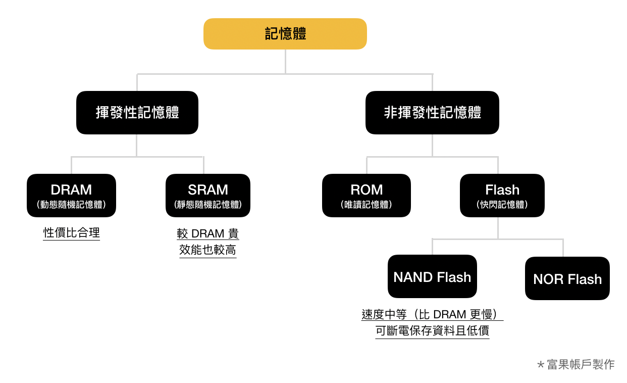 揮發性記憶體:顧名思義就是只要停止供電後,資料就會遺失,是「暫存」的概念。主要分為 DRAM(動態隨機記憶體,Dynamic Random Access Memory)和 SRAM(靜態隨機記憶體,Static Random Access Memory)。