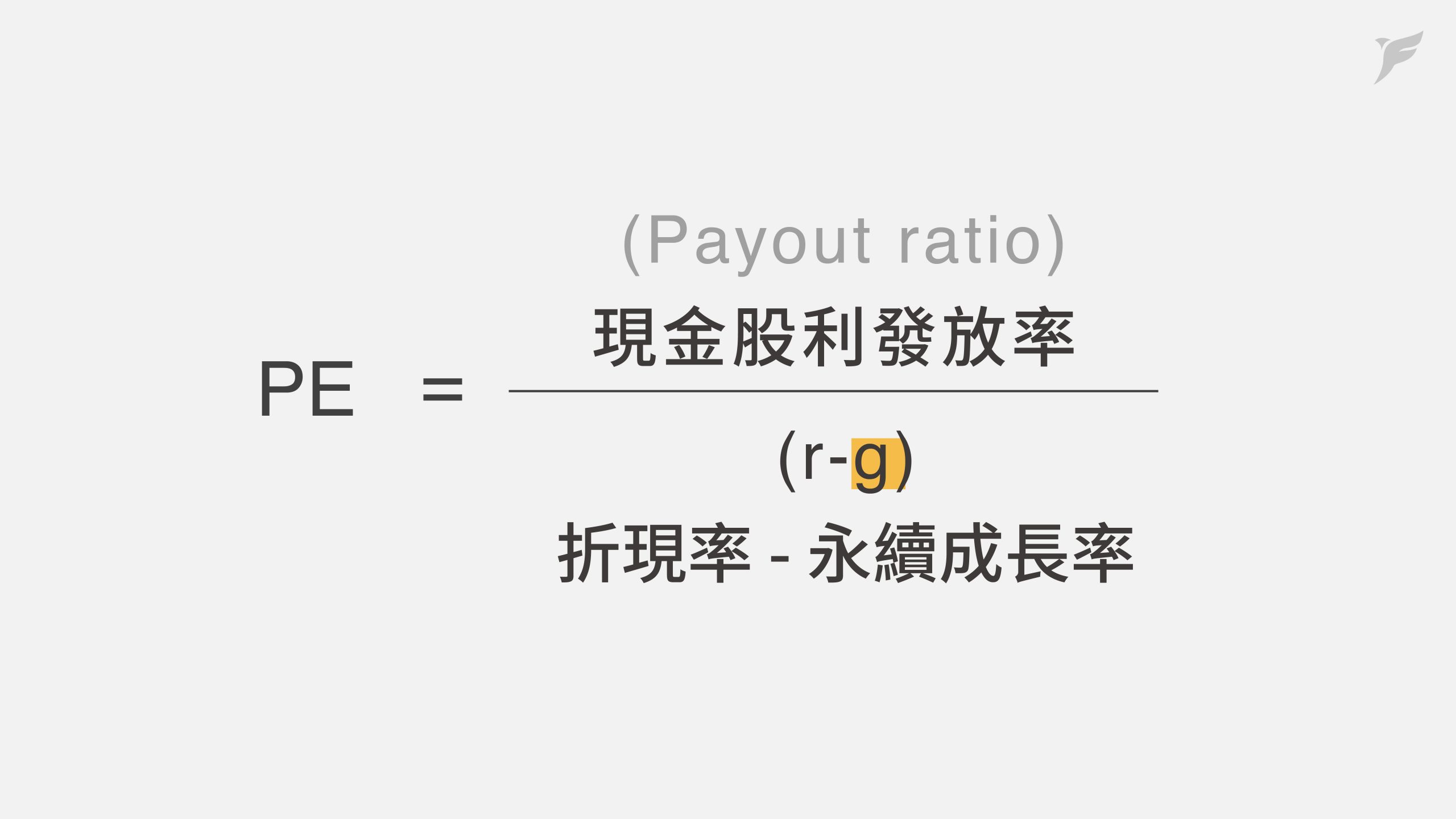 再精簡後可寫成 PE = Payout Ratio(現金股利發放率)/(r – g )。