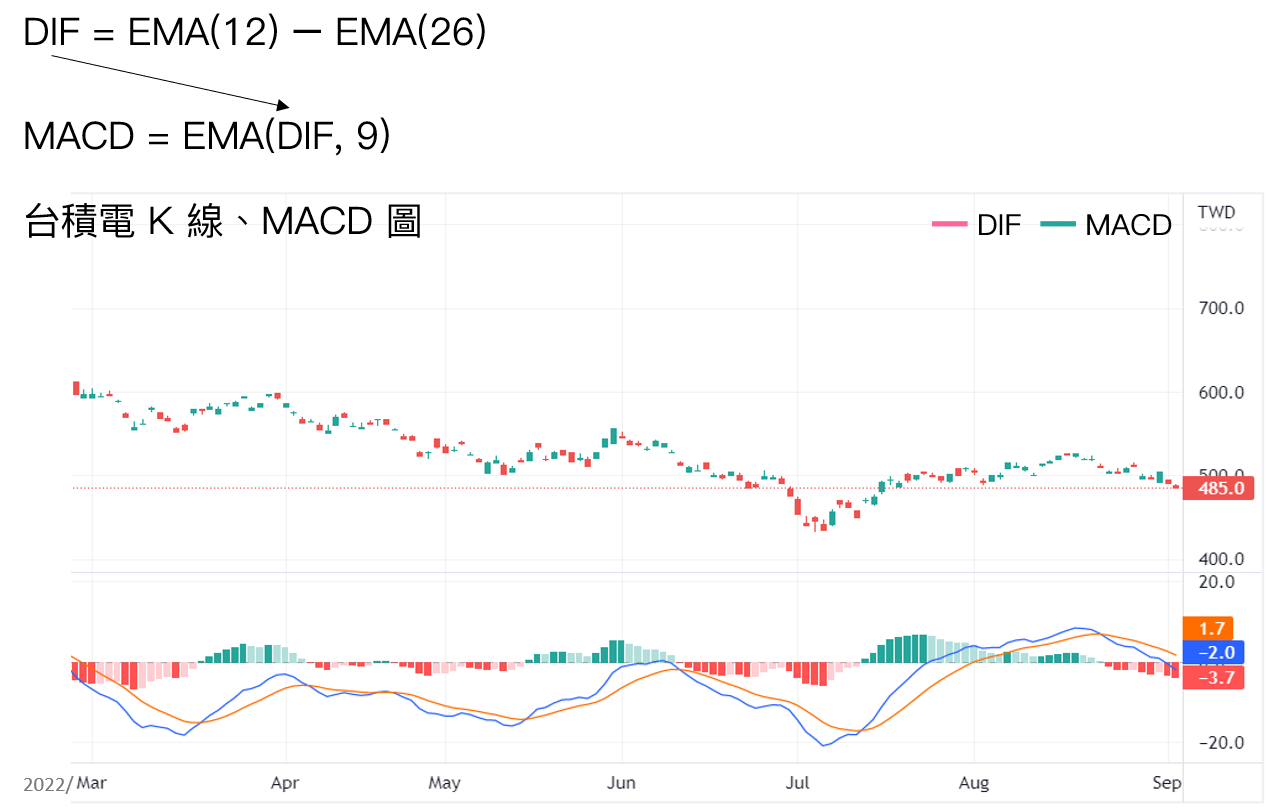 MACD 透過比較兩條長短天數的指數移動平均線(EMA),加以兩次的平滑處理後,來判斷股價的趨勢變化。MACD 總共由三個參數組成,最常見的組合使用了 12 日和 26 日的 EMA,得出兩者差值(DIF)後再計算其 9 日 EMA,即得到 MACD 值,公式如以下: