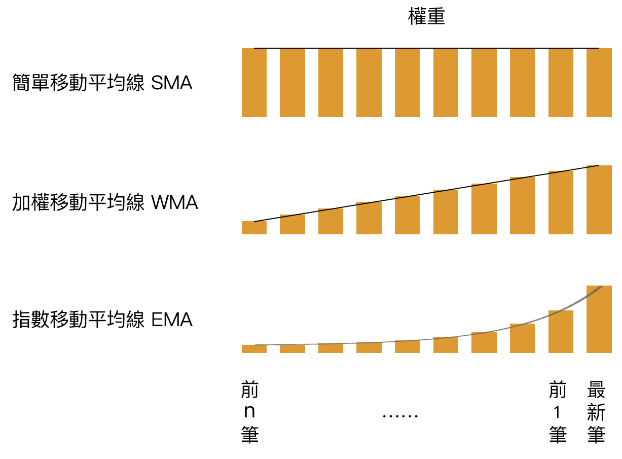 以上這種直接加總後取平均的計算方式稱為簡單移動平均線(Simple Moving Average,SMA),除此之外還有指數移動平均線(Exponential Moving Average,EMA)和加權移動平均線(Weighted Moving Average,WMA)兩種計算方式,兩者的邏輯在於:越近的股價應對近期的趨勢影響較大,因此計算平均值時給予近期數據較大權重、遠期數據較小權重,在實際應用上能協助我們更好掌握短期的趨勢改變。