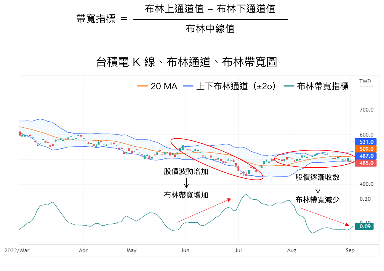 用以衡量一段期間的股價波動狀況,當帶寬指標變小,表示近期股價收斂,買賣方逐漸產生價格共識,接下來可能出現盤整行情,反之當帶寬指標變大則代表股價產生較大波動,買賣方的價格共識發生改變,接下來可能出現較明顯的上漲或下跌行情。其公式如下: