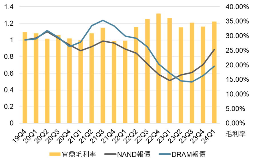 宜鼎主要專注於利基的工控領域,講求穩定及少量多樣的客製化需求,進入門檻相對消費性產品高,且進入後通常會有長期穩定的訂單,因此受記憶體市況影響較小,加上公司不會因市況波動調整採購策略,故毛利率不會隨報價有過大波動。