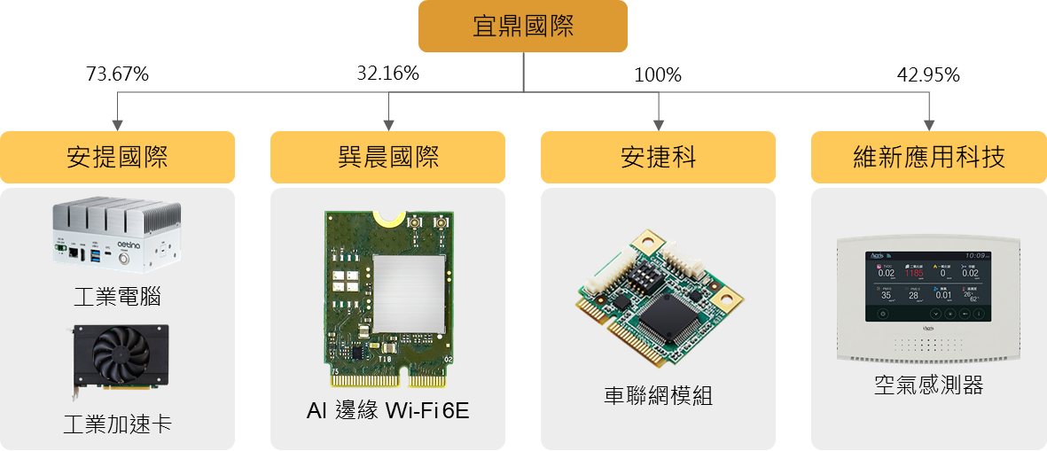 宜鼎(櫃:5289)為工控記憶體模組廠,2005 年由現任董事李鐘亮創立,在 2016 年交棒給現任董事長暨總經理簡川勝後,便積極拓展產品線,以打造完整工業解決方案為目標,目前除了工控記憶體模組,也推出 AIoT 周邊擴充模組、軟體等產品,並透過轉投資佈局工業電腦、車聯網模組、空氣感測器等。2023 年 DRAM 模組 / 工控 SSD 全球市占率為第八 / 第一。